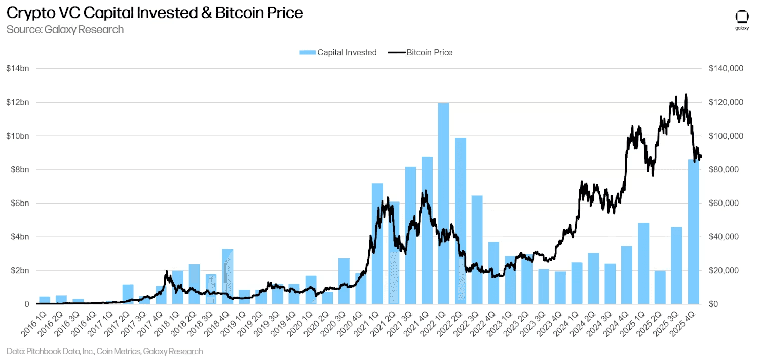 The historical correlation between Bitcoin price and crypto VC investment has weakened, with Bitcoin rallying since early 2023 while venture funding remains structurally subdued
