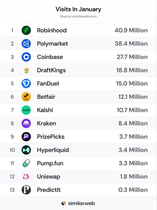 Polymarket ranked as the second most visited trading platform in January, trailing only Robinhood and ahead of Coinbase