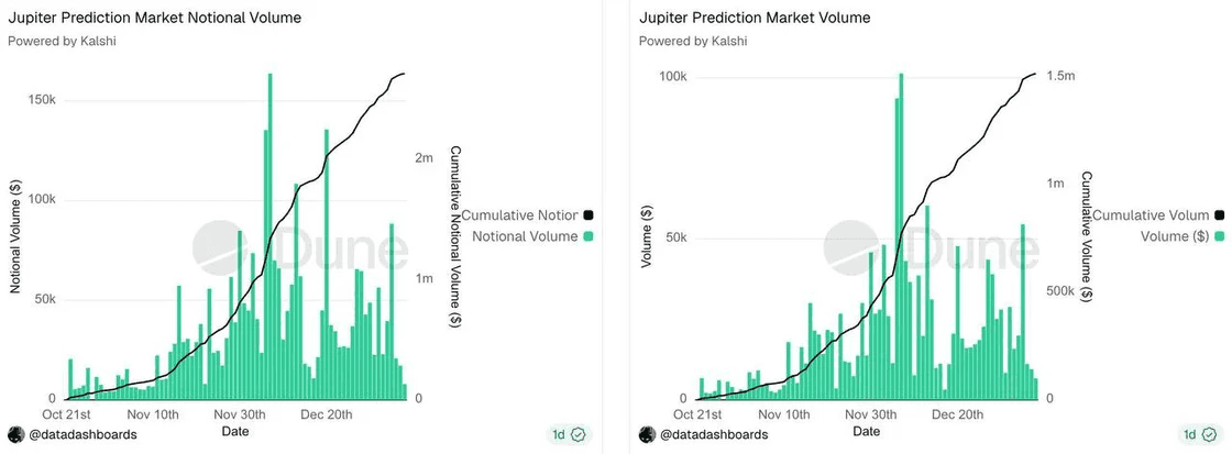 Jupiter’s prediction markets experiment hasn’t found traction yet: after ~2.5 months, cumulative volume is ~$1.5M across ~40K trades with only ~$53K in fees, suggesting users may still prefer trading prediction markets natively on dedicated platforms rather than via integrated surfaces like Jupiter