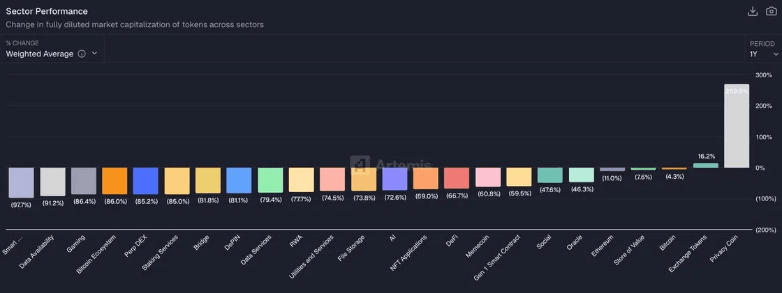 Only two crypto sectors are ending 2025 in positive territory - privacy tokens and exchange tokens - while every other major category is down on a fully diluted basis