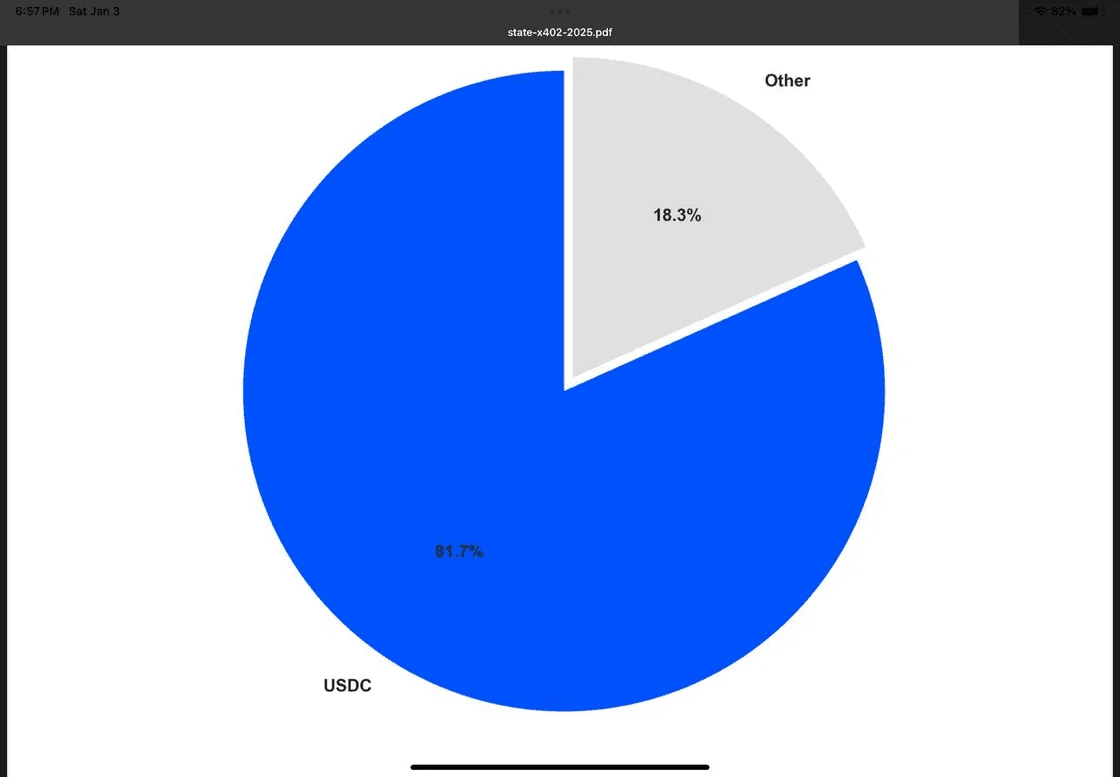 USDC accounts for ~82% of settlement volume in the x402 ecosystem, making it the dominant payment asset by a wide margin
