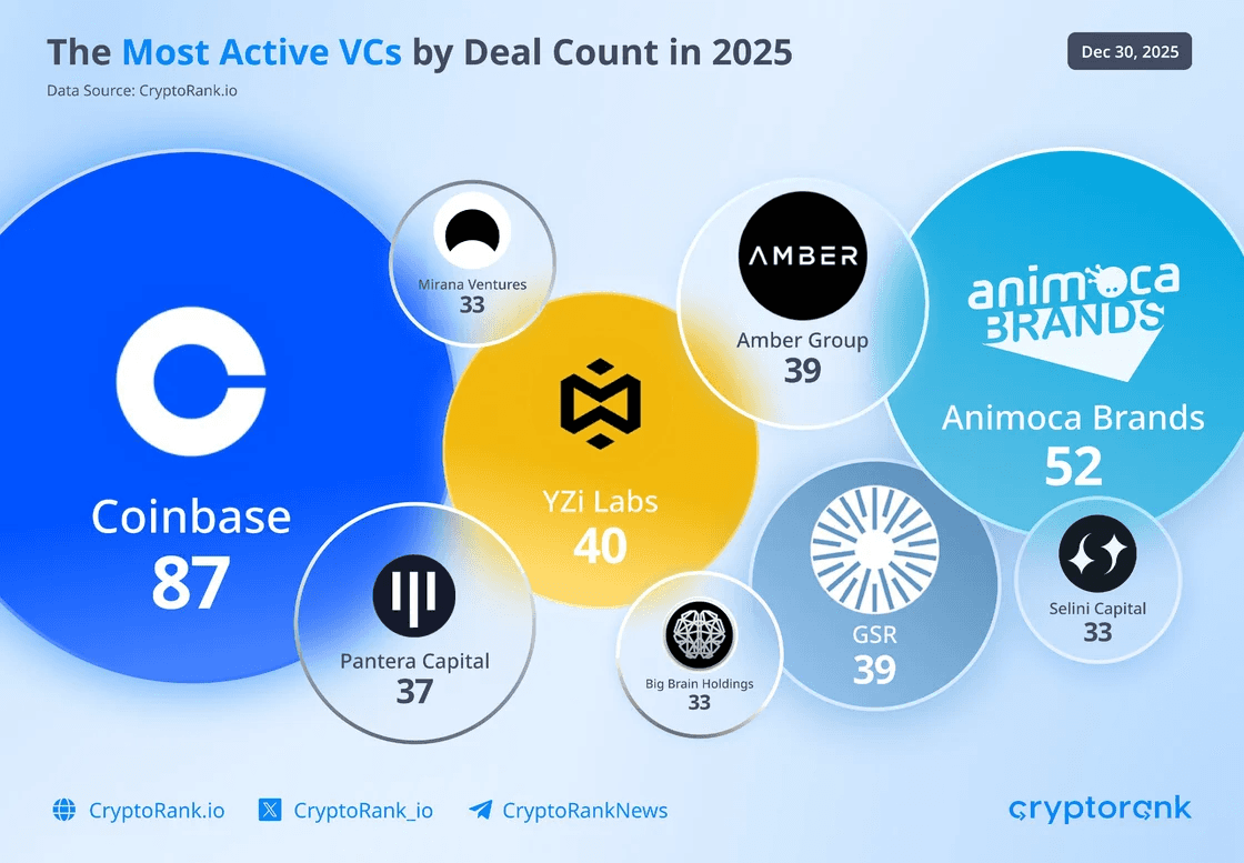 Coinbase led all crypto investors by deal count in 2025 with 87 investments, followed by Animoca Brands (52) and YZi Labs (40)