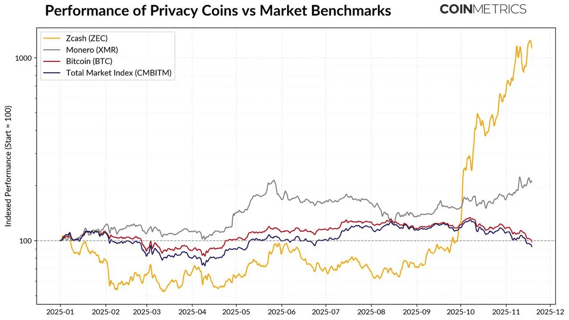 Privacy coins have sharply diverged from the market, with ZEC up ~9x since October while BTC and broader benchmarks retrace
