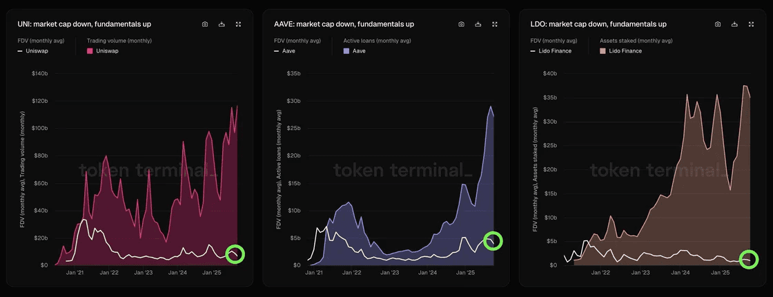 UNI, AAVE, and LDO fundamentals keep climbing while market caps drift lower, highlighting a growing gap between usage and price