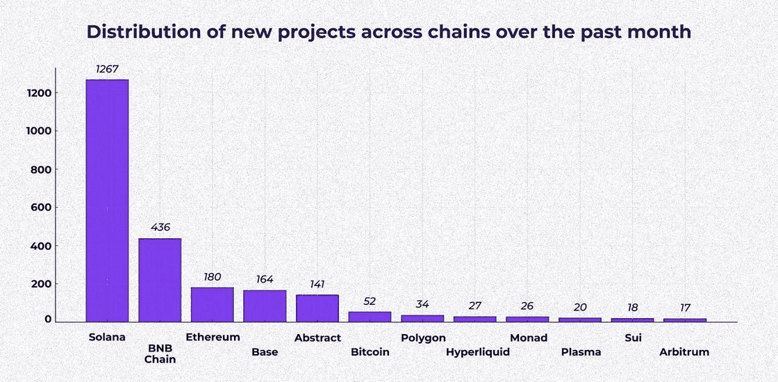 Solana remains the most favored chain for new project launches, outpacing all others by a wide margin in monthly developer activity