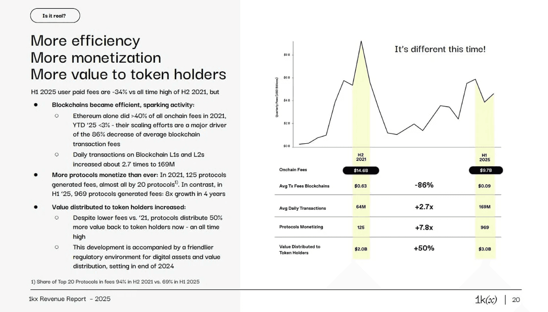 Over the past few years, onchain fees have declined sharply even as token value capture has grown, reflecting greater network efficiency and stronger protocol monetization