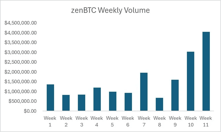 zenBTC reached an all-time high this week, surpassing $4MM in trading volume - marking its third consecutive week of accelerated growth