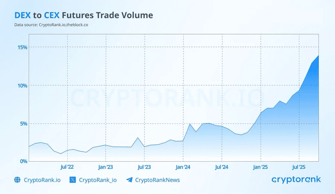 The share of futures volume executed on DEXs has climbed to a record high of almost 15%, up from just ~4% a year ago - reflecting accelerating migration of derivatives activity from centralized to onchain venues