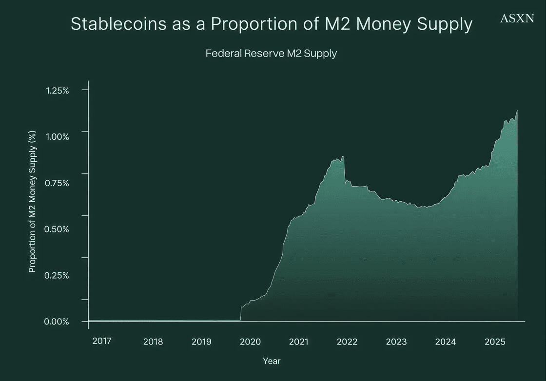Stablecoins now represent roughly 1.2% of the U.S. M2 money supply - their highest share to date and a signal of rising integration with the broader dollar system