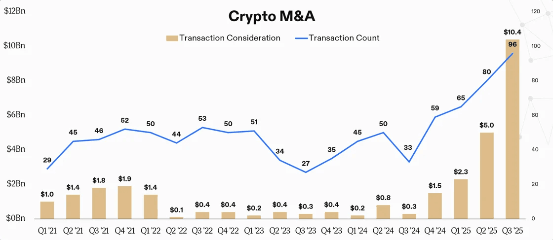 Crypto M&A volume hit a record $10.4Bn in Q3 ‘25 across 96 deals, more than doubling the previous quarter and marking the most active period in industry history