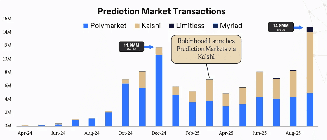 Prediction market activity hit an all-time high in September with 14.8MM monthly transactions, driven by Kalshi’s surge following its Robinhood integration, while Polymarket maintained a strong second position
