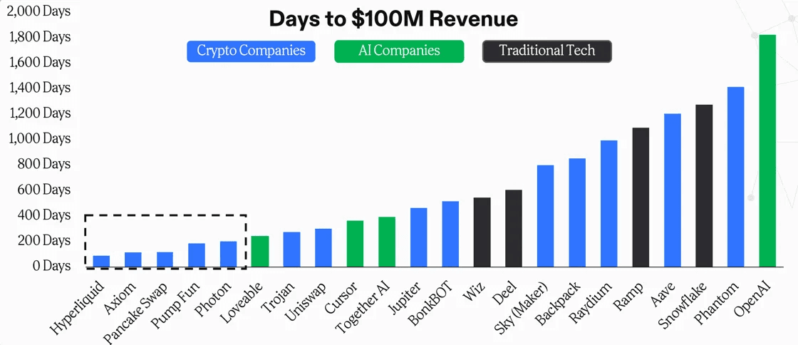 The DAE has produced the five fastest companies to reach $100MM in revenue, reflecting how onchain networks accelerate product adoption and capital formation