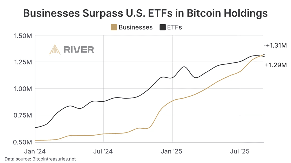 Bitcoin holdings by businesses have overtaken those held in U.S. ETFs for the first time, with companies now collectively holding ~1.31MM BTC compared to ETFs’ ~1.29MM BTC, reflecting the growing role of corporates in long-term Bitcoin accumulation