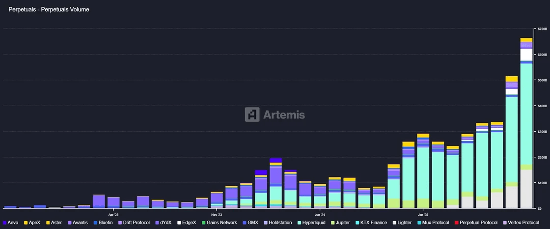 Perpetuals trading volume reached an all-time high for the fourth consecutive month, climbing to $664Bn in September vs. $516Bn in August. The surge is driven by the rapid growth of newer protocols like Hyperliquid and Aster, which are capturing meaningful market share alongside established players