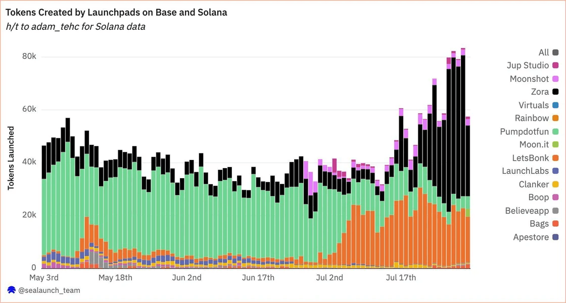 Base’s daily token issuance outpaced Solana launchpads from a surge in Zora creator coins.