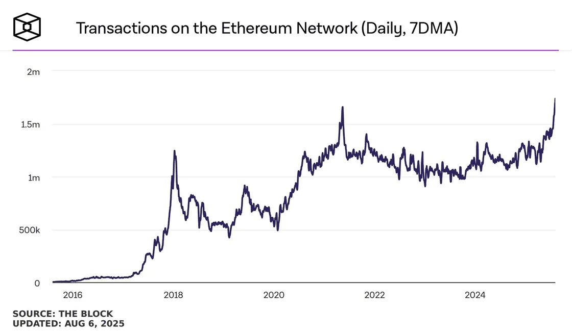 Ethereum daily transactions reached a new high, surpassing 2021 peak, as stablecoins and ETH treasuries reignited growth.